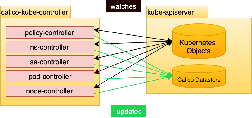 - Nodes (used to determine the associated subnet and inform the routing topology)- 컨트롤러에서 확인된 변경 사항을 기반으로 calico는 datastore를 update할 수 있음 (결국 각 calico-node에서 확인 및 적용됨)